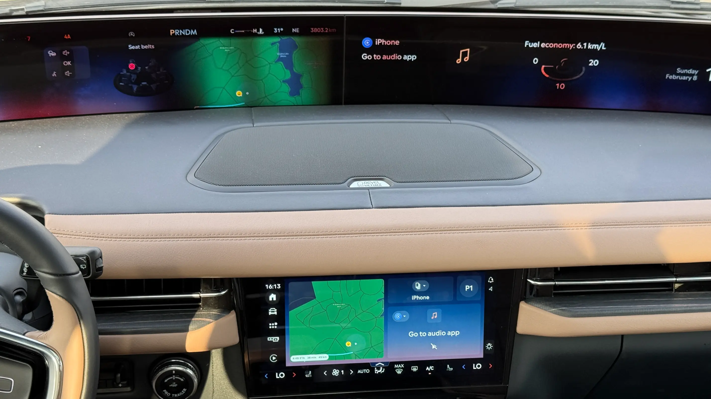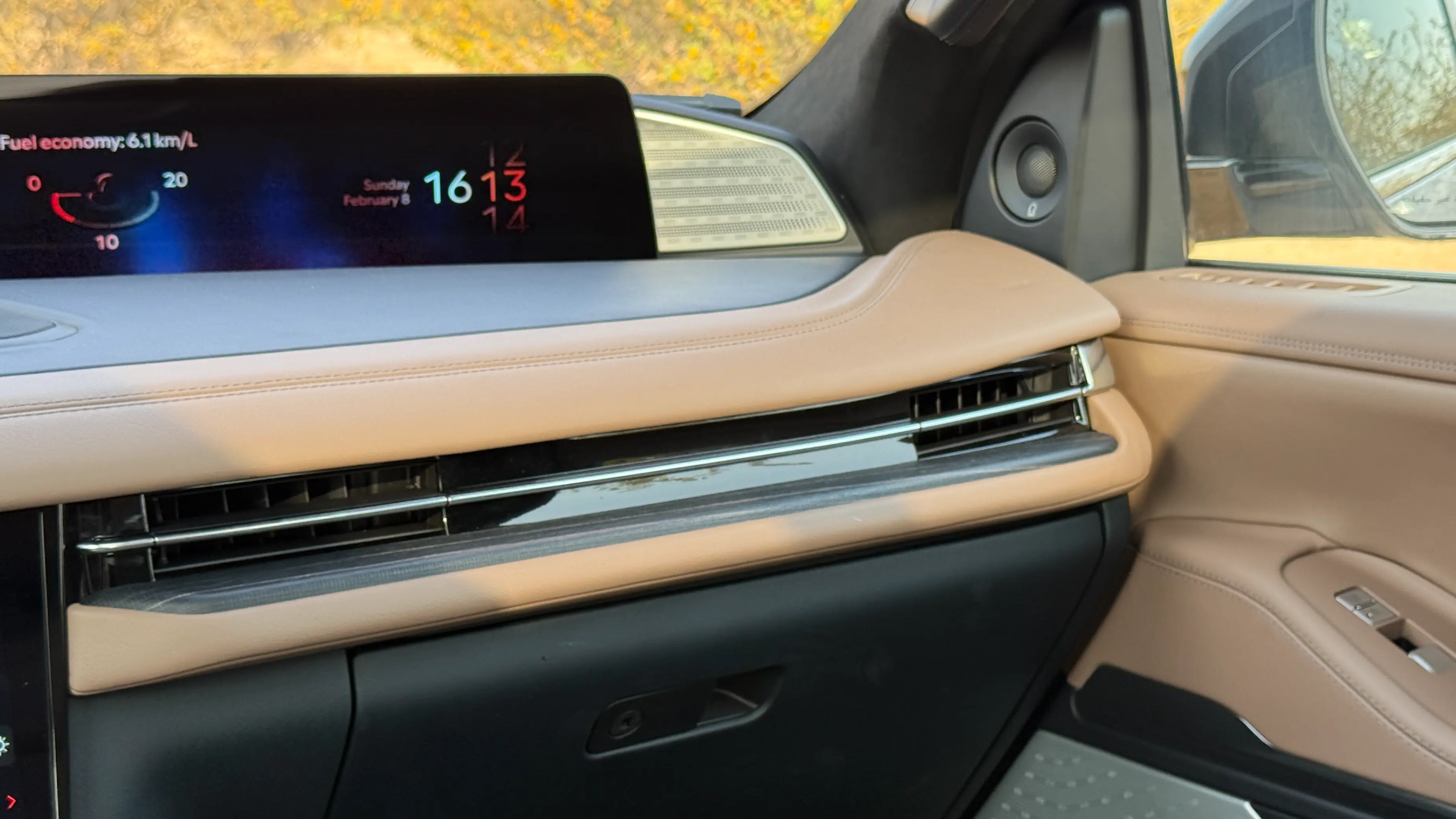 أما شاشة العرض البانورامية فتهيمن بقياس 48 بوصة تمتد بعرض الطبلون على المشهد، حيث توفر واجهة تفاعلية تعرض مناظر طبيعية مهدئة للأعصاب بدقة 4K.