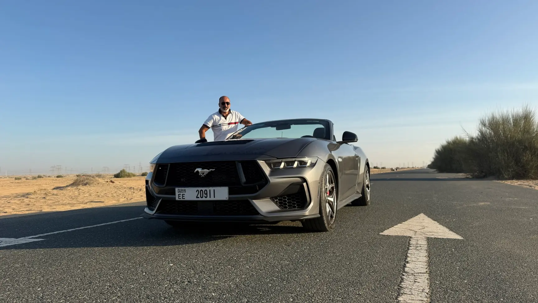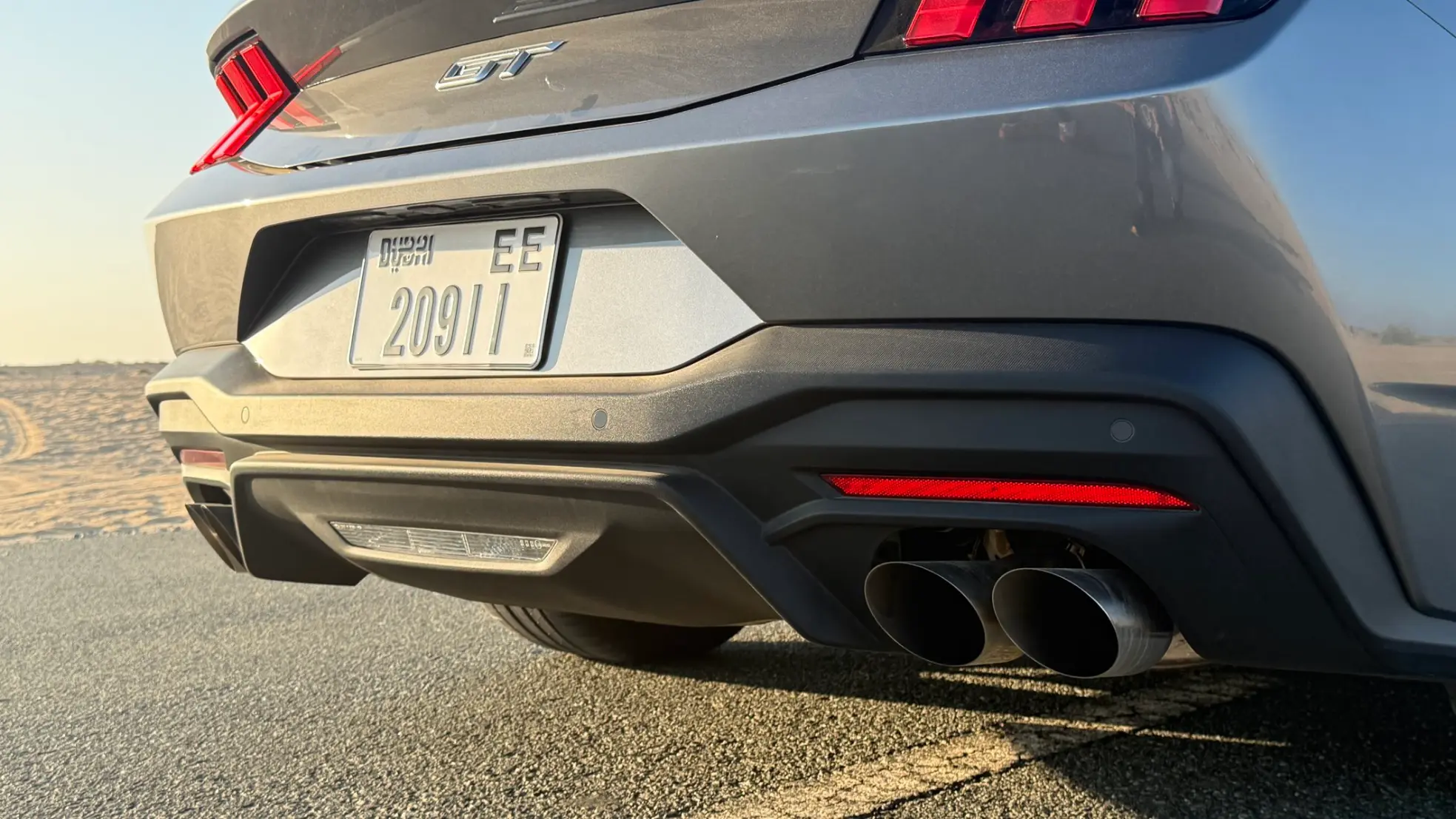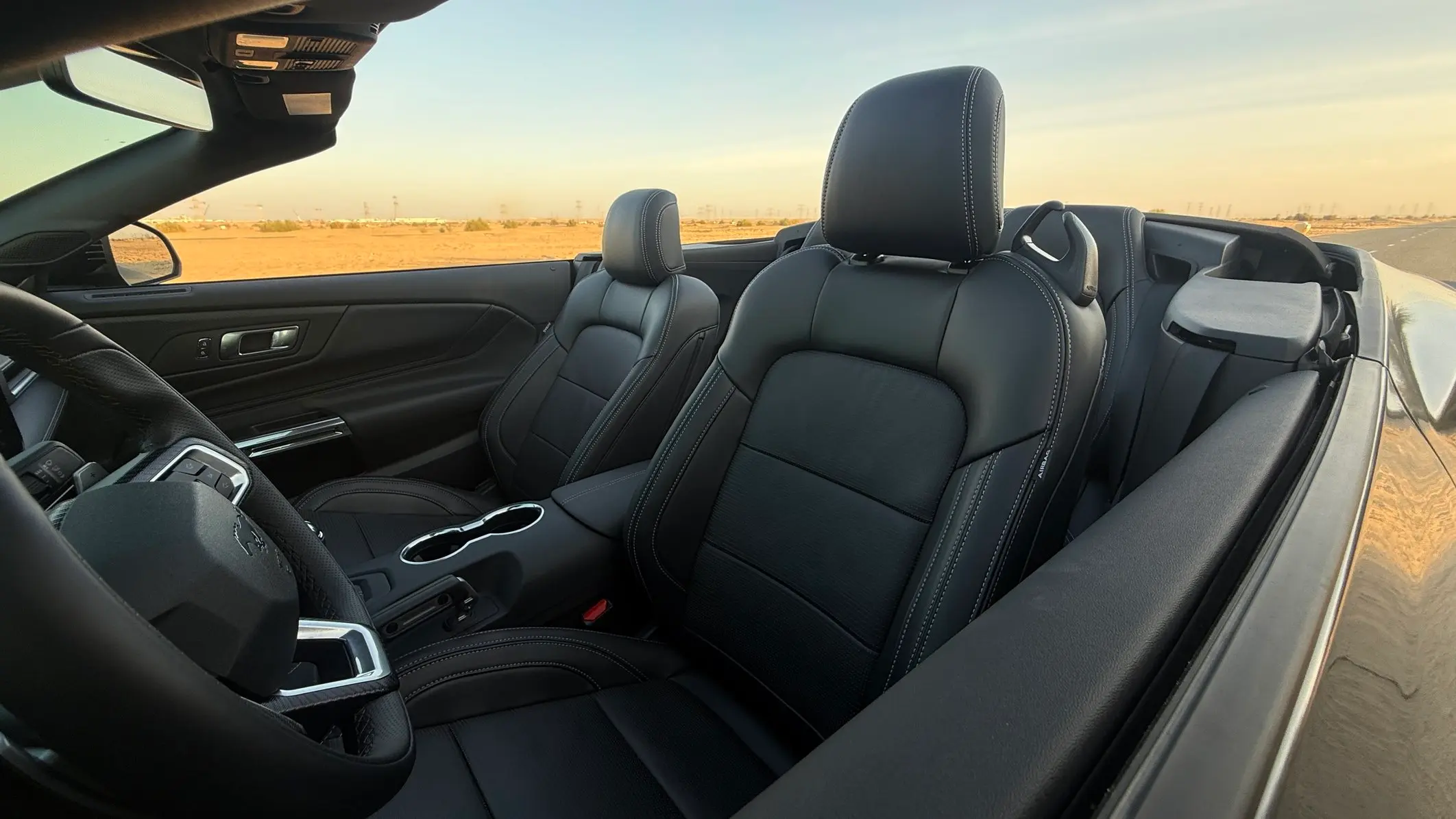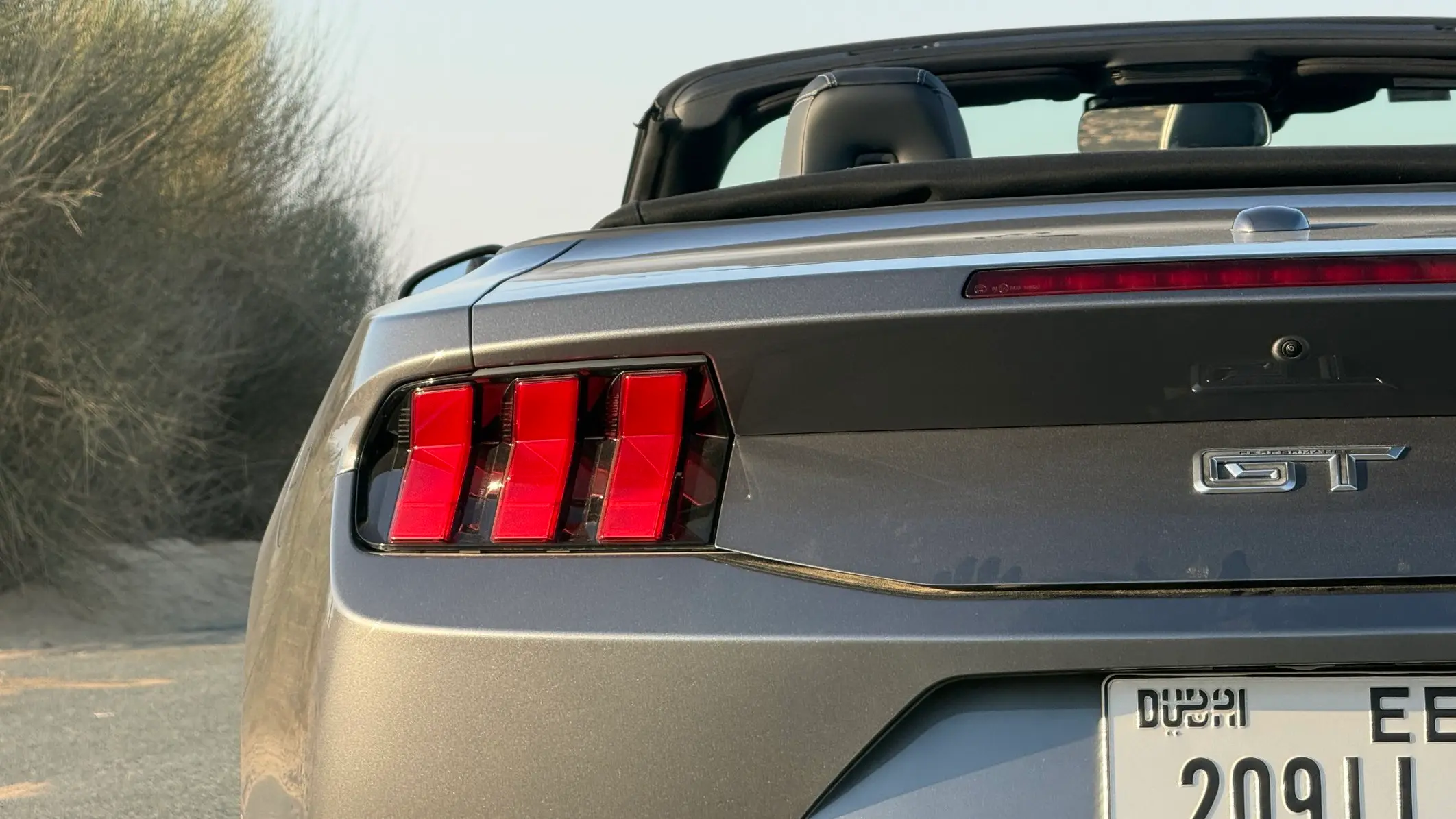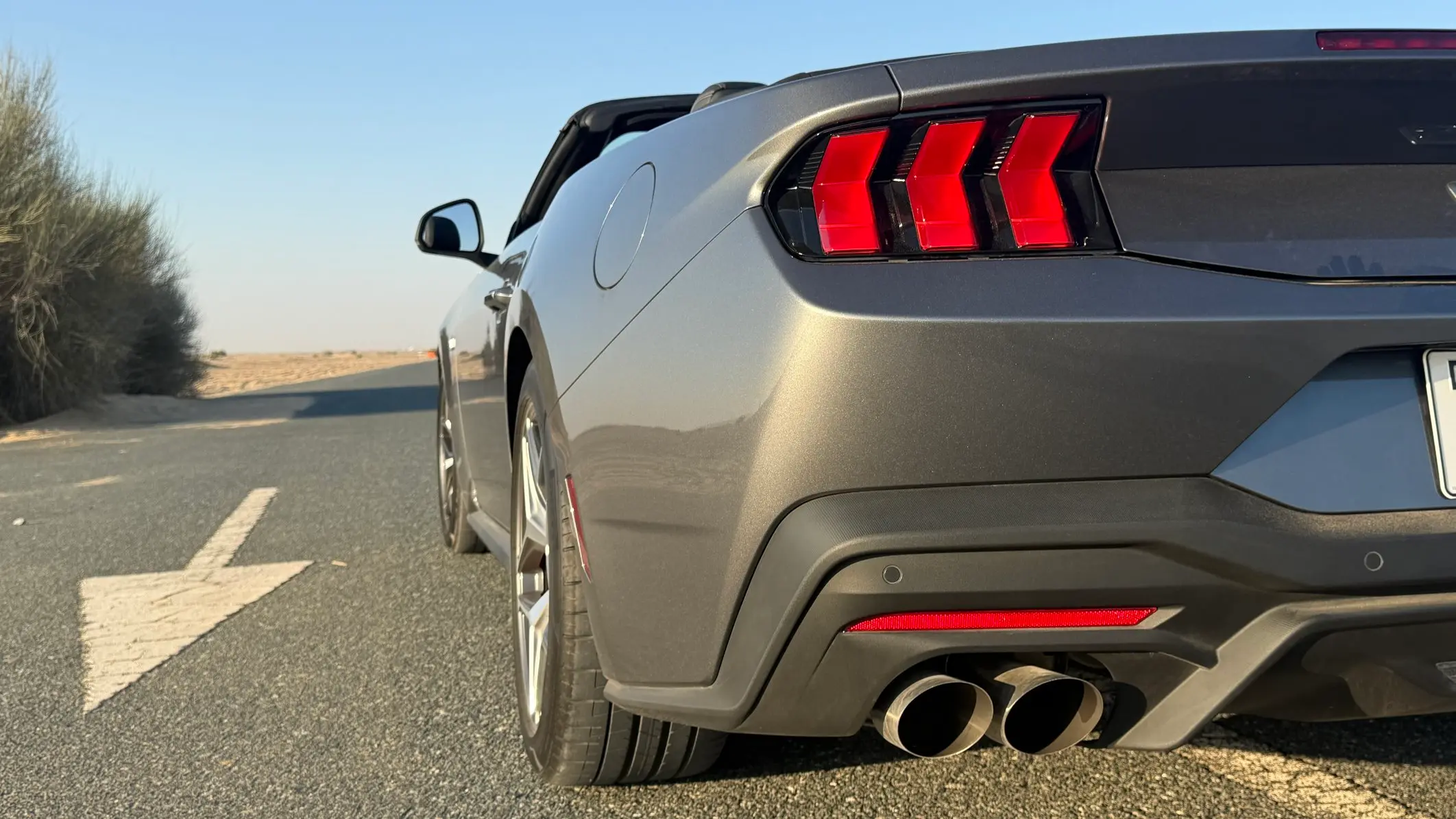 With the roof down, the Mustang feels perfectly suited to middle east weather during cooler months. Wind deflectors and smart airflow design help keep the cabin comfortable even at highway speeds. The rear design remains muscular, with tri bar taillights and dual exhaust outlets reinforcing the car’s muscle car identity.