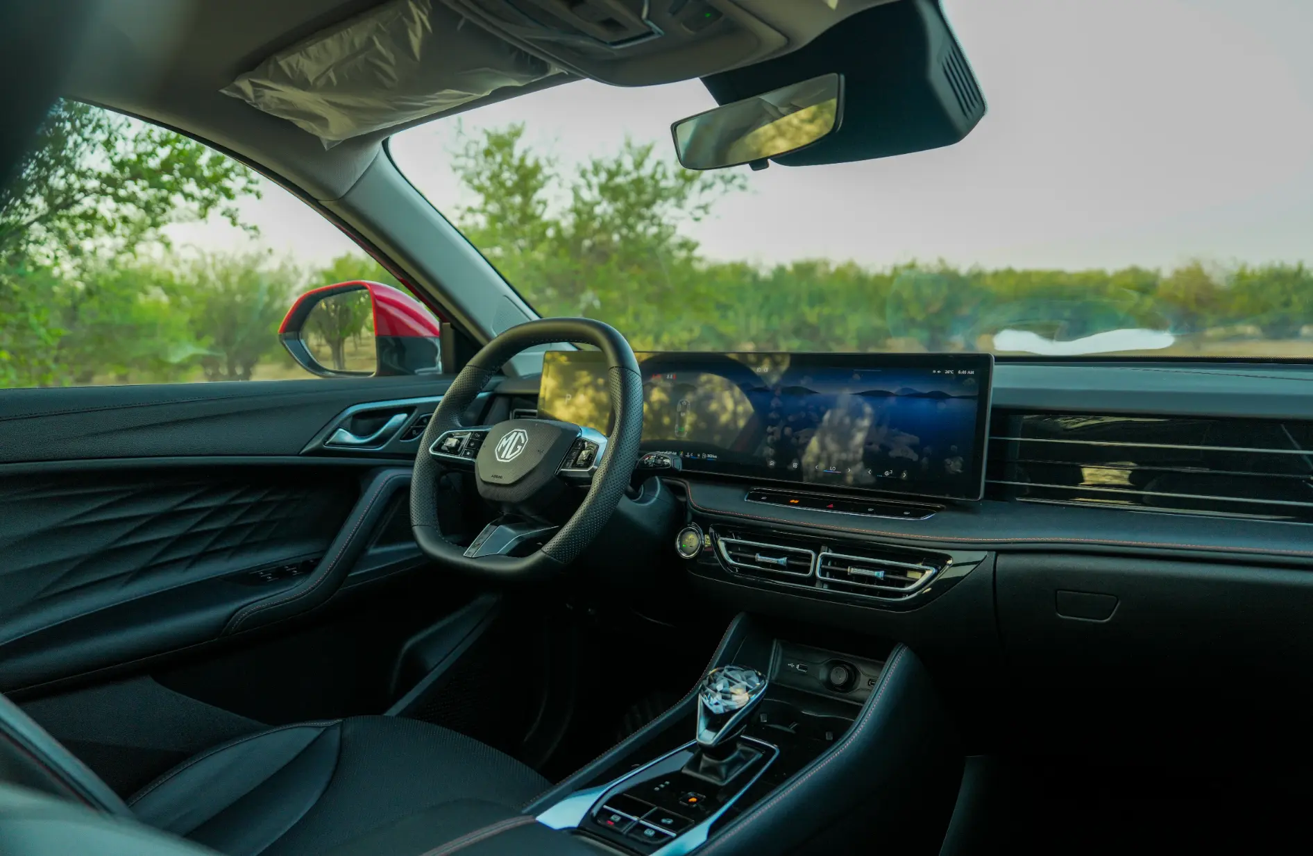Inside the MG HS Hybrid Plus, drivers are welcomed by a spacious cabin lined with leather upholstery and premium finishes. The centerpiece is a large 27 inch infotainment screen that controls everything from media and navigation to drive modes and climate.