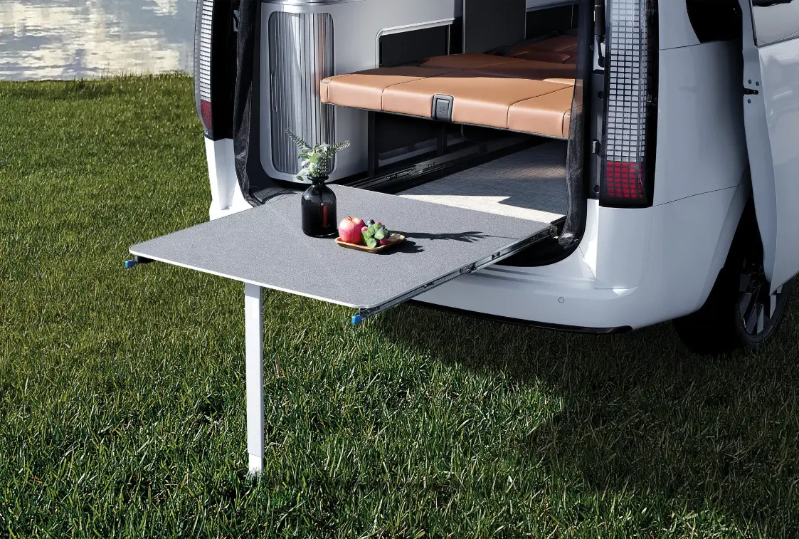 The back of the van opens up to reveal a pull out table and an outdoor shower—perfect for camping, beach days, or washing off your gear. With all these smart touches, the Staria Camper is more than just a van. It’s a small apartment you can take anywhere.